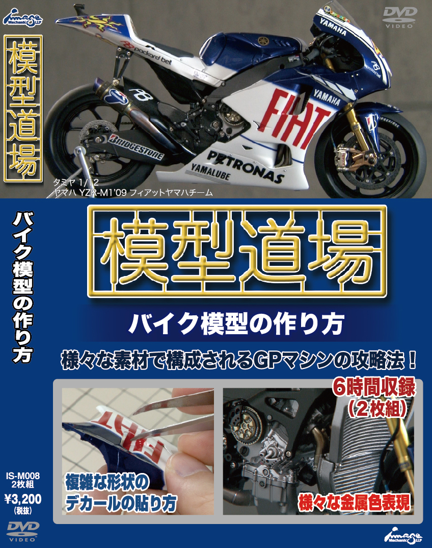 タミヤ 1/12 YZR-M1'09 フィアットヤマハチームを作例に、様々な素材で構成されるGPマシンの作り方をご紹介します。金属色表現、マフラー焼け、複雑な形状のデカールの貼り方など上級テクニックが満載です!